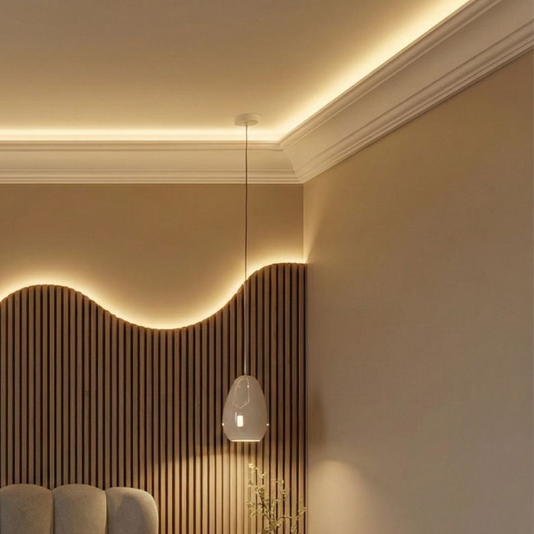 This XPS downlight coving combines soft ambient LED glow with practical recessed spotting in one clean, modern profile. The super-lightweight construction makes it easy to handle and quick to install with adhesive only, with no heavy tools or fixings needed. It creates a smooth wash of light across the ceiling while allowing focused downlight exactly where you need it. The surface is moisture-resistant, crack-free, and ready to paint, making it a simple way to add both mood lighting and everyday illumination to contemporary interiors.